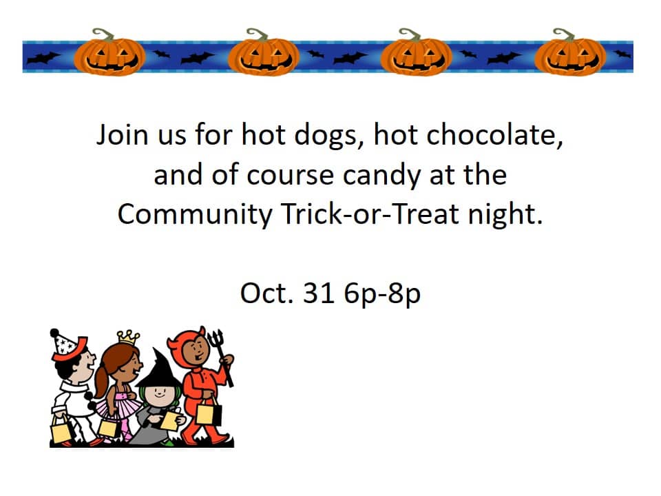 We’ll be handing out Hot dogs, Hot chocolate, and candy for the Sharon Center Community Trick or Treat night on Oct. 31 from 6p-8p. Dress in costume and come help pass out goodies! Candy can be donated to be passed out thru Oct.